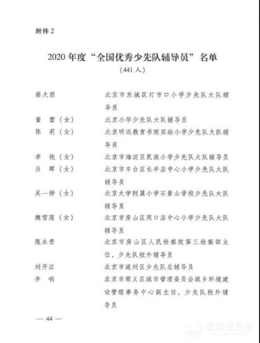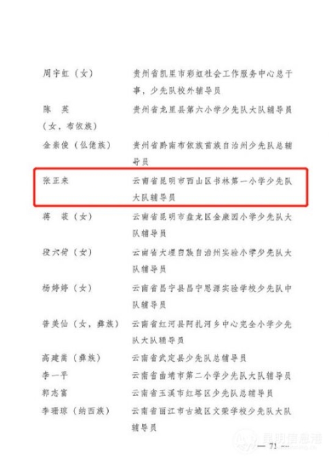 近日,共青團(tuán)中央、教育部、全國(guó)少工委評(píng)選表彰了2020年度“全國(guó)優(yōu)秀少先隊(duì)員”“全國(guó)優(yōu)秀少先隊(duì)輔導(dǎo)員”“全國(guó)優(yōu)秀少先隊(duì)集體”。云南省昆明市西山區(qū)書林第一小學(xué)少先隊(duì)大隊(duì)輔導(dǎo)員張正來獲“全國(guó)優(yōu)秀少先隊(duì)輔導(dǎo)員”殊榮。