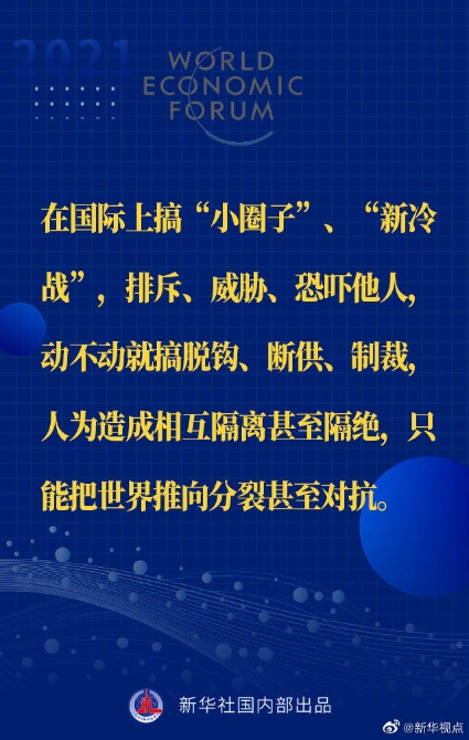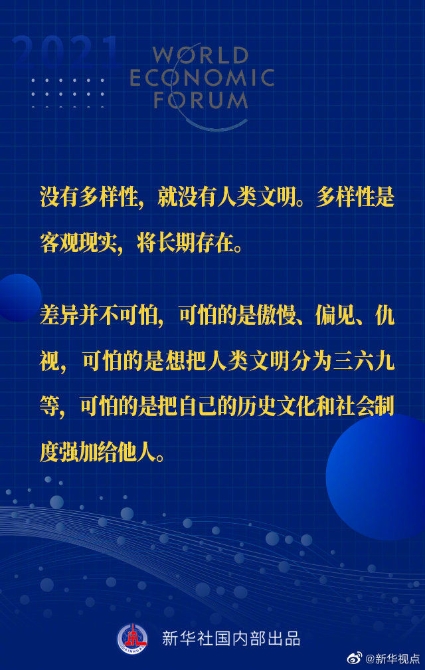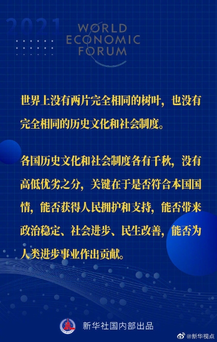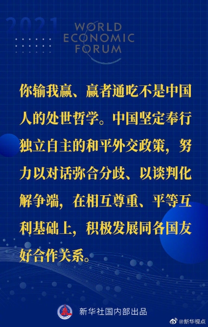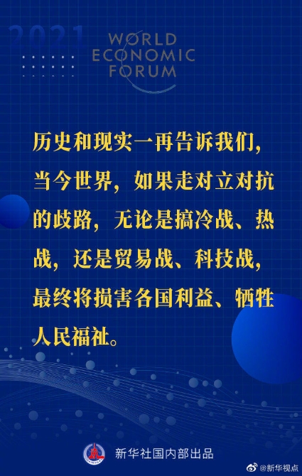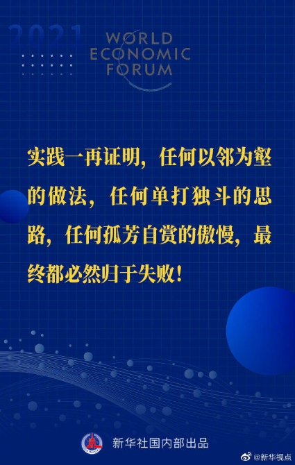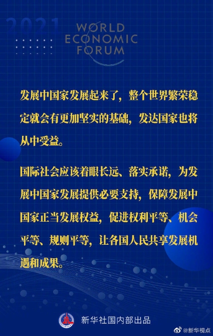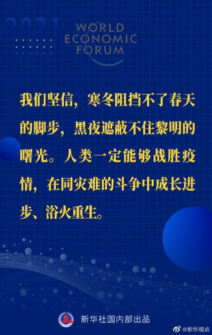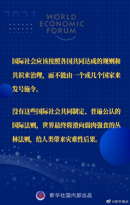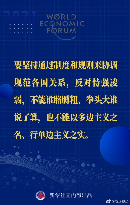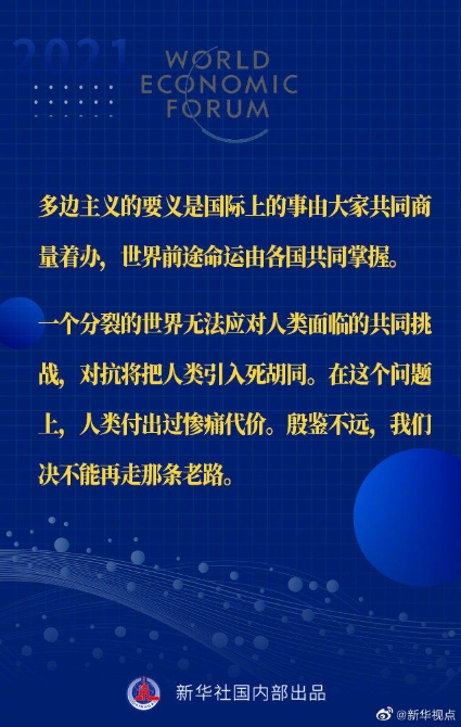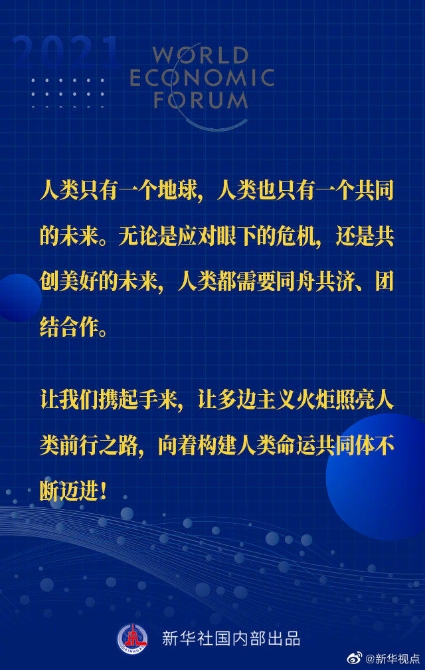 【習(xí)近平主席“達(dá)沃斯議程”特別致辭金句來啦!】1月25日晚,國(guó)家主席習(xí)近平在北京以視頻方式出席世界經(jīng)濟(jì)論壇“達(dá)沃斯議程”對(duì)話會(huì),并發(fā)表題為《讓多邊主義的火炬照亮人類前行之路》的特別致辭。一起來看金句↓↓