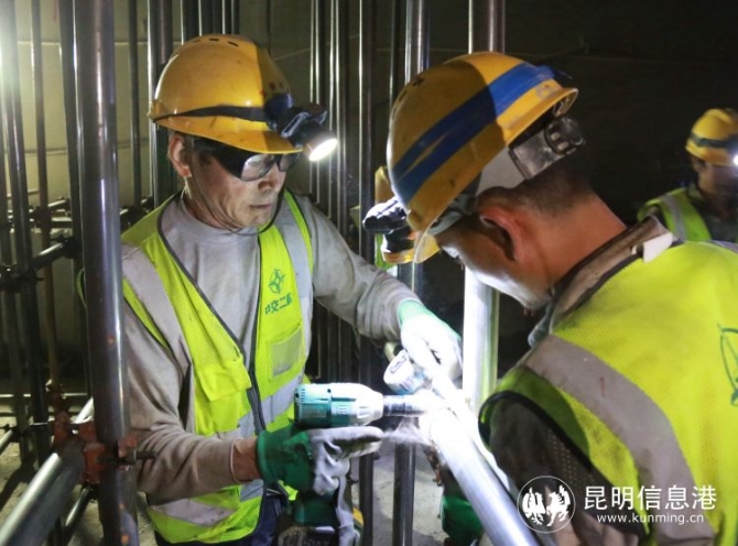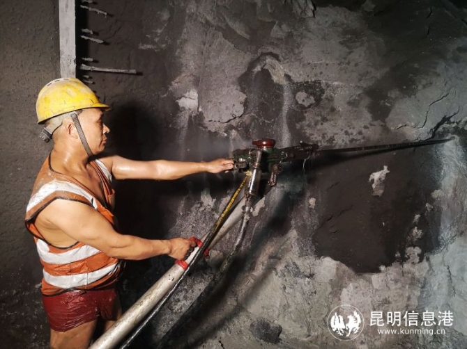 中交二航局施工人員冒著高溫在隧道內(nèi)進(jìn)行鉆孔作業(yè)