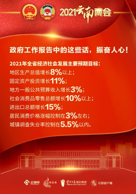 政府工作報(bào)告指出,2021年政府工作的總體要求是:以習(xí)近平新時(shí)代中國特色社會主義思想為指導(dǎo),全面貫徹黨的十九大和十九屆二中、三中、四中、五中全會及中央經(jīng)濟(jì)工作會議精神,持續(xù)深入學(xué)習(xí)貫徹習(xí)近平總書記考察云南重要講話精神,堅(jiān)持穩(wěn)中求進(jìn)工作總基調(diào),立足新發(fā)展階段,貫徹新發(fā)展理念,融入新發(fā)展格局,以推動高質(zhì)量發(fā)展為主題,以深化供給側(cè)結(jié)構(gòu)性改革為主線,以改革創(chuàng)新為根本動力,以滿足人民日益增長的美好生活需要為根本目的,堅(jiān)持系統(tǒng)觀念,鞏固拓展疫情防控和經(jīng)濟(jì)社會發(fā)展成果,鞏固夯實(shí)全面建成小康社會和脫貧攻堅(jiān)成果,更好統(tǒng)籌發(fā)展和安全,扎實(shí)做好“六穩(wěn)”工作、全面落實(shí)“六?!比蝿?wù),科學(xué)精準(zhǔn)落實(shí)宏觀政策,努力保持經(jīng)濟(jì)運(yùn)行在合理區(qū)間,堅(jiān)持?jǐn)U大內(nèi)需戰(zhàn)略,強(qiáng)化科技戰(zhàn)略支撐,擴(kuò)大高水平對外開放,確?!笆奈濉遍_好局起好步,努力在建設(shè)我國民族團(tuán)結(jié)進(jìn)步示范區(qū)、生態(tài)文明建設(shè)排頭兵、面向南亞東南亞輻射中心上不斷取得新進(jìn)展,以優(yōu)異成績慶祝建黨100周年。