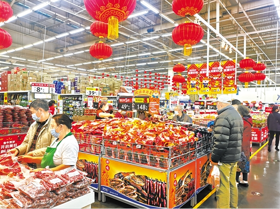 記者在沃爾瑪(國(guó)貿(mào)店)看到,超市備貨充足,前來(lái)選購(gòu)年貨的市民絡(luò)繹不絕,糧油、零食、堅(jiān)果、臘肉等產(chǎn)品較受歡迎。
