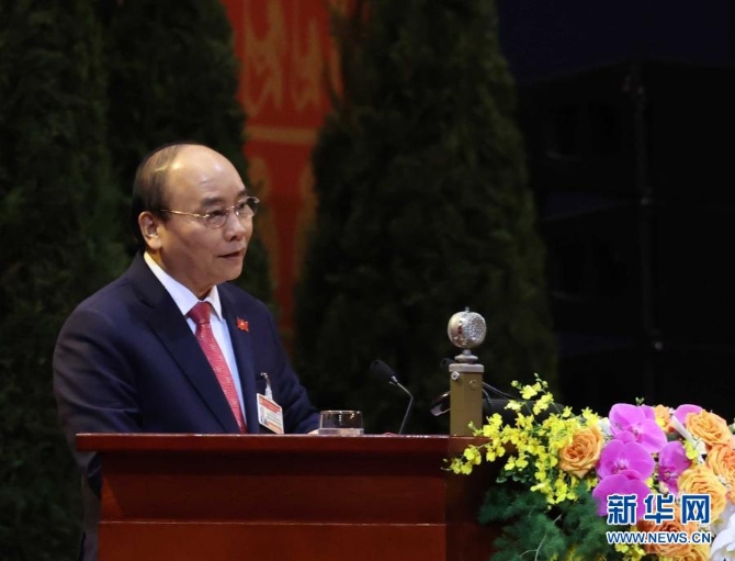 1月26日,在越南首都河內,越共中央政治局委員、政府總理阮春福在越南共產黨第十三次全國代表大會開幕式上致辭。新華社/越通社