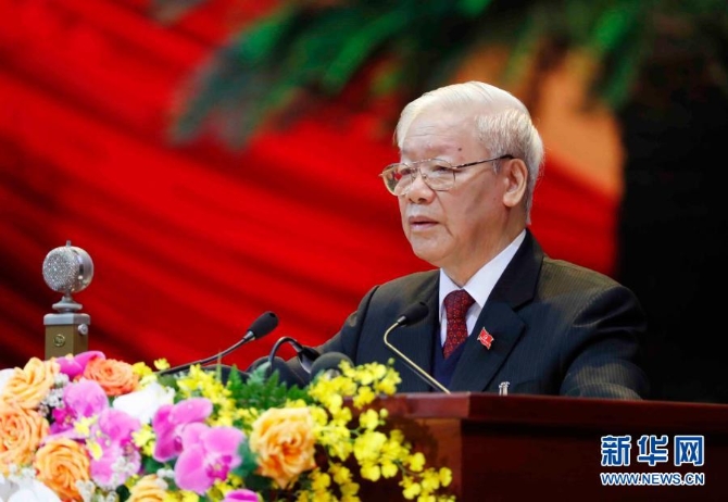 1月26日,在越南首都河內,越共中央總書記、國家主席阮富仲作第十二屆中央委員會提交的報告。新華社/越通社