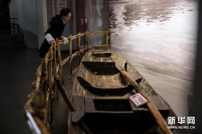 1月26日,李若雪在遵義會(huì)議陳列館內(nèi)查看自己參加工作后接手維護(hù)的第一件文物——紅軍南渡烏江時(shí)使用的木船。新華社記者 歐東衢攝
