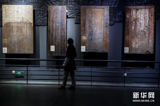 1月26日,李若雪在遵義會(huì)議陳列館內(nèi)查看紅軍木板標(biāo)語的狀況。新華社記者 歐東衢攝