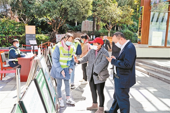游客在進(jìn)入麗江古城景區(qū)前掃描健康碼和行程卡。