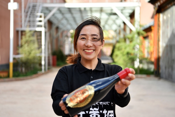 西藏芒康縣藏東珍寶酒業(yè)有限公司副總經(jīng)理曲措在展示一款“達美擁”葡萄酒(2020年5月4日攝)。新華社記者 詹彥 攝
