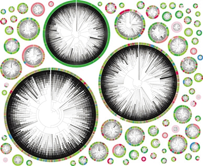 始于單個癌細胞的系統(tǒng)發(fā)育樹。每種顏色代表體內(nèi)的不同位置,五顏六色的樹顯示出高度轉(zhuǎn)移的表型。