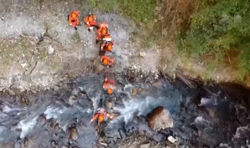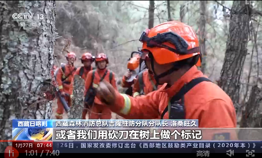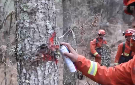 西藏森林消防總隊吉隆駐防分隊分隊長 洛桑旺久:像我這樣進入林子以后,然后每隔20米左右,你們要用就是用漆也可以,如果實在沒有漆,你們拿身上的一些布料或者我們利用砍刀在樹上做個標(biāo)記。