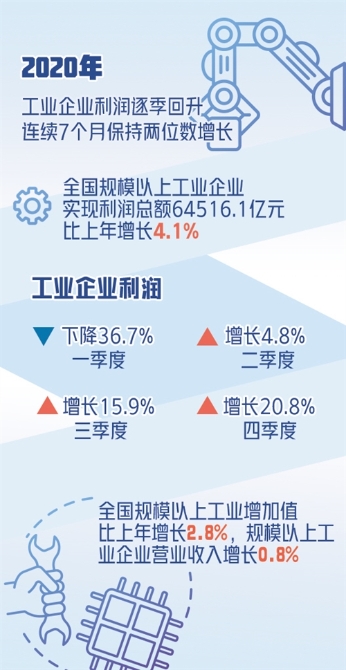 “2020年,全國(guó)規(guī)模以上工業(yè)增加值比上年增長(zhǎng)2.8%,規(guī)模以上工業(yè)企業(yè)營(yíng)業(yè)收入增長(zhǎng)0.8%。生產(chǎn)和銷售穩(wěn)定恢復(fù),為利潤(rùn)增長(zhǎng)提供了有力支撐?!眹?guó)家統(tǒng)計(jì)局工業(yè)司高級(jí)統(tǒng)計(jì)師朱虹表示,分季度看,企業(yè)利潤(rùn)呈現(xiàn)“由負(fù)轉(zhuǎn)正、逐季加快”的走勢(shì)。受疫情嚴(yán)重沖擊影響,一季度利潤(rùn)同比大幅下降36.7%,隨著“六穩(wěn)”“六保”任務(wù)不斷落實(shí)落細(xì),企業(yè)復(fù)工復(fù)產(chǎn)水平穩(wěn)步提升,二季度利潤(rùn)增長(zhǎng)4.8%,三季度增速回升至15.9%,四季度進(jìn)一步加速至20.8%。12月份,規(guī)模以上工業(yè)企業(yè)利潤(rùn)同比增長(zhǎng)20.1%,增速比11月加快4.6個(gè)百分點(diǎn),繼5月份實(shí)現(xiàn)月度增速由負(fù)轉(zhuǎn)正后,連續(xù)7個(gè)月保持兩位數(shù)增長(zhǎng)。