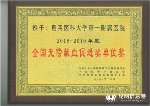 1月8日,國(guó)家衛(wèi)生健康委員會(huì)、中國(guó)紅十字會(huì)總會(huì)和中央軍委后勤保障部衛(wèi)生局聯(lián)合發(fā)布《關(guān)于表彰2018-2019年度全國(guó)無(wú)償獻(xiàn)血表彰獎(jiǎng)勵(lì)獲獎(jiǎng)?wù)叩臎Q定》,該院再獲“全國(guó)無(wú)償獻(xiàn)血促進(jìn)獎(jiǎng)單位獎(jiǎng)”榮譽(yù),這是昆醫(yī)大附一院連續(xù)第二屆獲此殊榮。