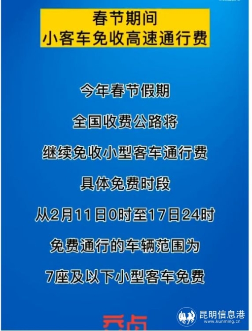 昆明信息港訊 實(shí)習(xí)記者鄧國(guó)梅 1月28日,記者從交通運(yùn)輸部獲悉,根據(jù)國(guó)務(wù)院有關(guān)通知,今年春節(jié)假期,全國(guó)收費(fèi)公路將繼續(xù)免收小型客車通行費(fèi),具體免費(fèi)時(shí)段為2月11日0時(shí)至17日24時(shí)。