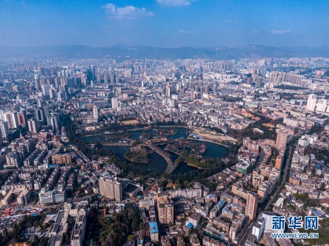 從中共云南地下黨建黨舊址上空俯瞰昆明城區(qū)(無人機照片,1月22日攝)。新華社 記者江文耀/攝