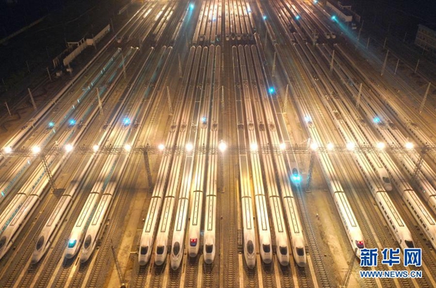 這是1月27日晚在南寧動車所存車線拍攝的檢修整備好的動車組列車(無人機(jī)照片)。新華社記者 周華/攝