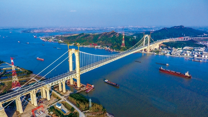 滬蘇通長(zhǎng)江公鐵大橋是世界最大跨度公鐵兩用斜拉橋。大橋北起南通,南至張家港,主跨1092米,是高速公路、客貨混線鐵路和高速鐵路“三合一”的過(guò)江通道。