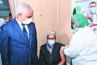1月29日,摩洛哥衛(wèi)生大臣哈立德·阿伊特·塔利布(左)視察拉巴特一家醫(yī)院,見證一名醫(yī)務(wù)人員接種中國國藥集團(tuán)的新冠滅活疫苗。新華社發(fā)