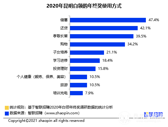 對于如何分配年終獎,47.4%的昆明白領選擇儲蓄,占比最高,緊隨其后的是占比42.1%的“還貸”。39.5%的昆明白領表示會將獎金孝敬長輩,還有34.2%的人表示會用來購物。