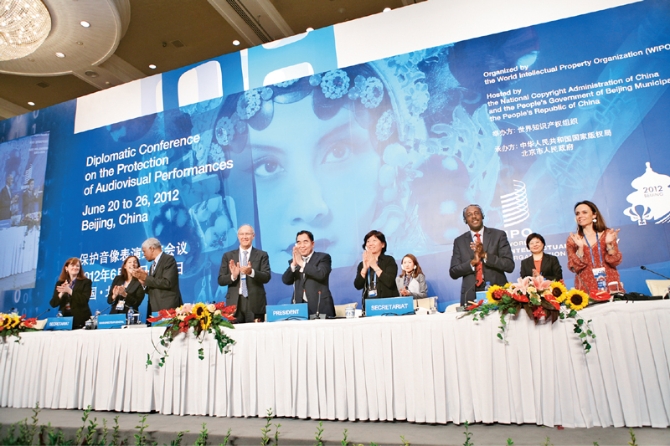 2020年4月28日,新中國(guó)成立以來(lái)第一個(gè)在我國(guó)締結(jié)、以我國(guó)城市命名的國(guó)際知識(shí)產(chǎn)權(quán)條約——《視聽(tīng)表演北京條約》(簡(jiǎn)稱(chēng)《北京條約》)正式生效。《北京條約》的締結(jié)和生效,成為國(guó)際知識(shí)產(chǎn)權(quán)保護(hù)領(lǐng)域的一個(gè)重要里程碑,體現(xiàn)出國(guó)際社會(huì)對(duì)我國(guó)近年來(lái)版權(quán)保護(hù)工作的高度關(guān)注和認(rèn)可。圖為2012年6月世界知識(shí)產(chǎn)權(quán)組織(WIPO)在北京締結(jié)《視聽(tīng)表演北京條約》。 中宣部版權(quán)管理局供圖