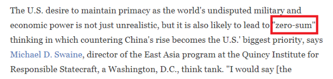 美國全國公共廣播電臺(NPR):美國希望保持作為世界上無可爭議的軍事和經(jīng)濟力量的主導(dǎo)地位不僅是不現(xiàn)實的,而且很可能導(dǎo)致零和思維。這種做法可能會疏遠(yuǎn)亞洲和其他地區(qū)的盟友和伙伴。