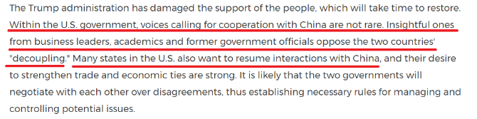 喬治·布什美中關(guān)系基金會總裁方大為:中美關(guān)系在過去四年受到了損害。特朗普政府發(fā)起的貿(mào)易戰(zhàn)并沒有像美國所希望的那樣消除與包括中國在內(nèi)的主要商業(yè)伙伴的貿(mào)易逆差。中美兩國有競爭更有合作,只有認(rèn)同這兩個基本事實,才能有效推動世界上最重要的雙邊關(guān)系向前發(fā)展。