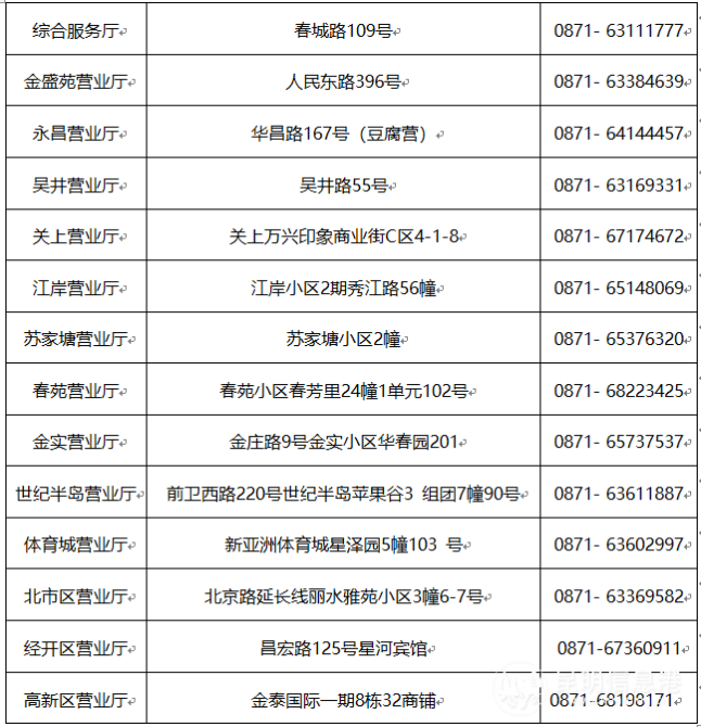 云南昆侖燃氣昆明主城區(qū)營業(yè)廳地址和電話: