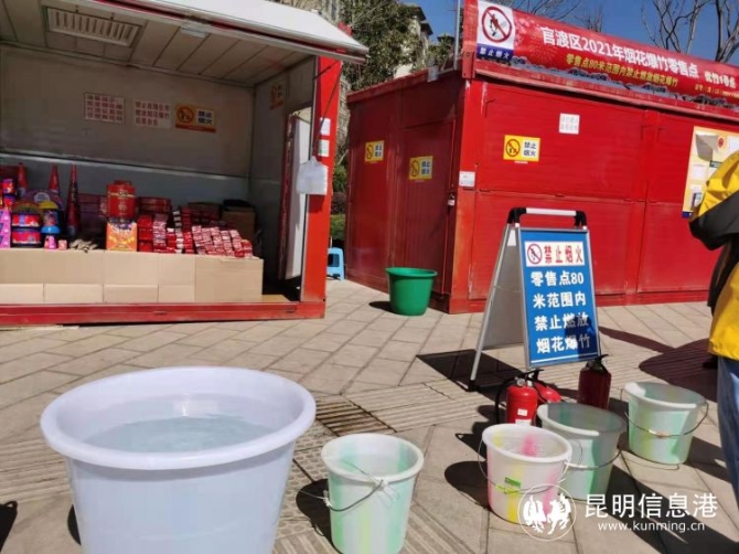 在官渡區(qū)古渡口路與付家營路交叉口的一個零售點上,記者看到,該攤點由兩個安全倉組成,其中一個用來銷售煙花爆竹,另一個則用來儲存煙花爆竹。在安全倉內外的顯眼位置,掛有“嚴禁煙火”、“禁止煙火”“零售點80米范圍內禁止燃放煙花爆竹”等字樣的提示標語。同時,還在醒目的位置張貼著煙花爆竹經營(零售)許可證、煙花爆竹零售安全承諾書、煙花爆竹安全購買燃放須知等。在這個銷售點的安全倉外,擺放著大大小小的水桶,里面都裝滿水,可以隨時滅火急用。此外,記者還注意到,今年所有零售點上,都禁止拉線接電,全部按要求使用充電爐。