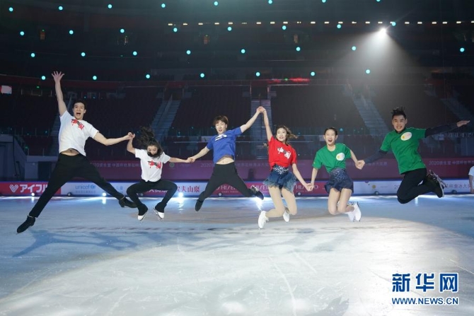 這是2020年11月8日,中國冰舞組合王詩玥(左二)/柳鑫宇(左一)、男單選手金博洋(左三)、女單選手陳虹伊(右三)、雙人滑組合彭程(右二)/金楊在2020中國杯世界花樣滑冰大獎賽為觀眾表演后合影。新華社記者 鞠煥宗 攝