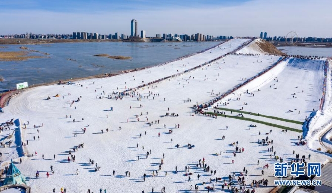 這是2021年1月30日,市民在寧夏銀川市閱?;﹫?chǎng)體驗(yàn)冰雪項(xiàng)目(無(wú)人機(jī)照片)。新華社記者 馮開華 攝