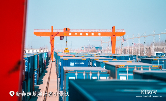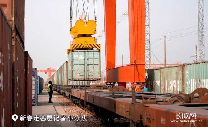 2月2日,伴隨著汽笛聲,火車(chē)駛進(jìn)冀中南智能港內(nèi),停在車(chē)輛??刻?。吊車(chē)開(kāi)始加緊作業(yè),將一件件集裝箱裝載到火車(chē)上,里面是滿滿的貨物。