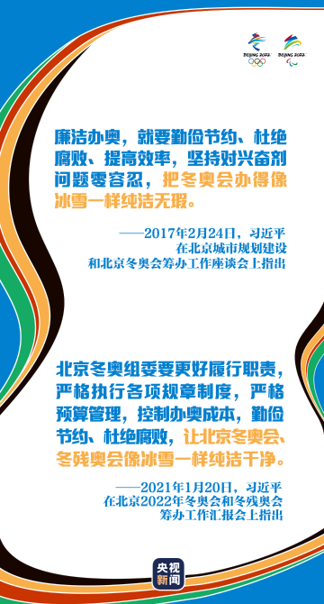 “堅(jiān)持廉潔辦奧,嚴(yán)格預(yù)算管理,控制辦奧成本,強(qiáng)化過程監(jiān)督,讓冬奧會(huì)像冰雪一樣純潔干凈?!?/p>