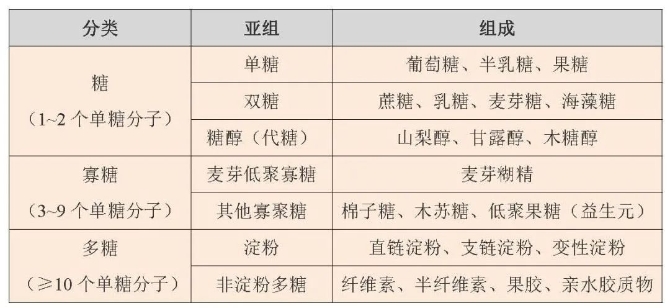 糖類又名碳水化合物,這類化合物的化學(xué)分子式是碳和水的倍數(shù)。聯(lián)合國糧農(nóng)組織和世界衛(wèi)生組織(FAO/WHO)專家組將糖類按照其聚合度分為三類,如下面的表格。