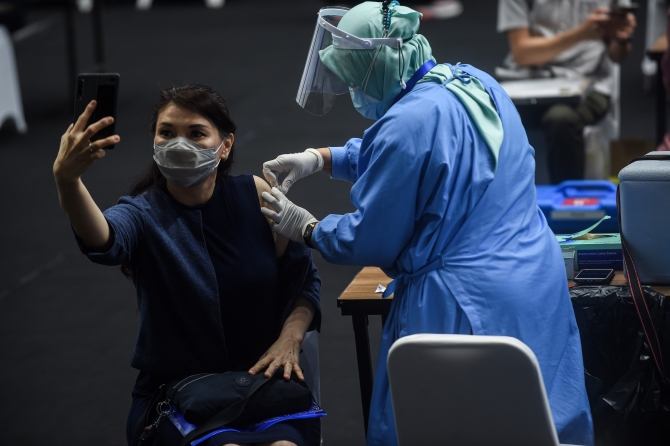 ↑ 2月4日,一名醫(yī)務工作者在印度尼西亞雅加達接種中國科興公司的新冠疫苗后自拍。