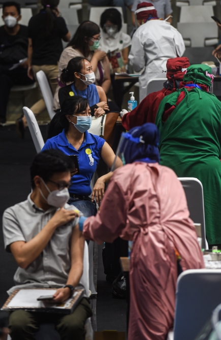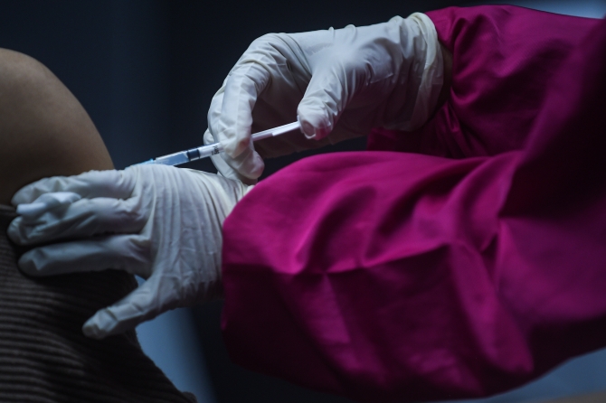 ↑ 2月4日,醫(yī)務工作者在印度尼西亞雅加達接種中國科興公司的新冠疫苗。