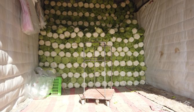 又一車白菜,到場不多時(shí)就被采購空了多半個(gè)車廂。