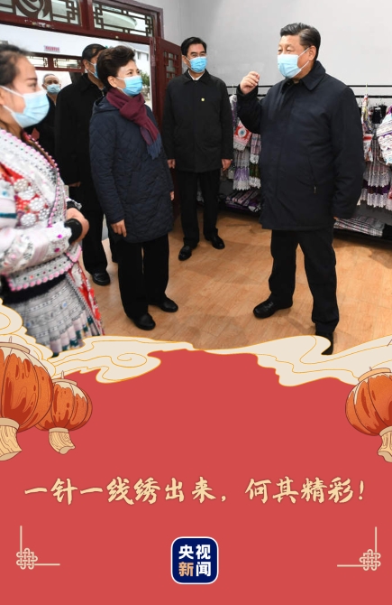 習(xí)近平向村民詳細(xì)詢問制作工藝流程,對(duì)大家說:“把苗繡發(fā)揚(yáng)光大,傳統(tǒng)的也是時(shí)尚的。它既是文化又是產(chǎn)業(yè)?!?nbsp;