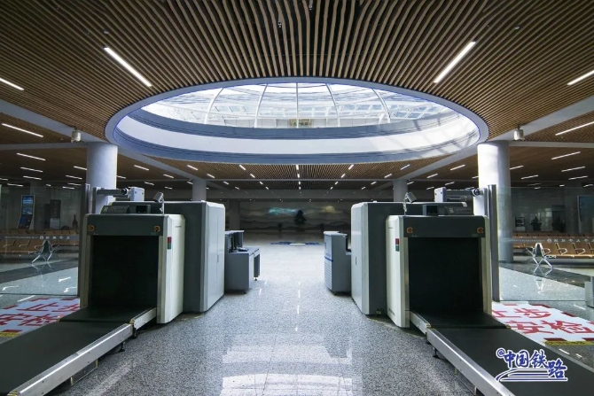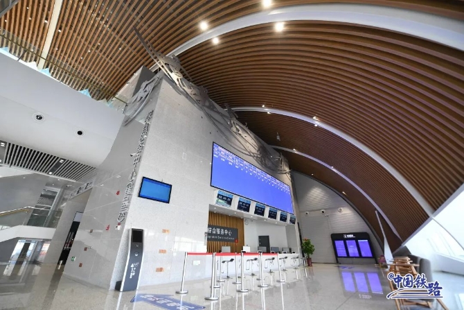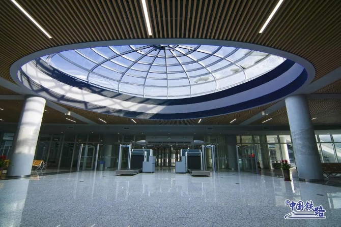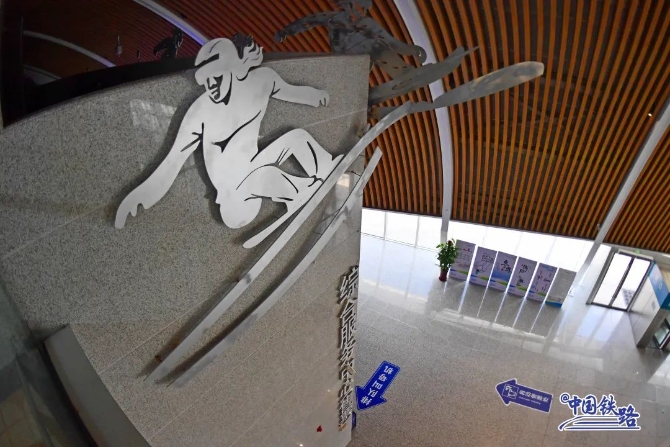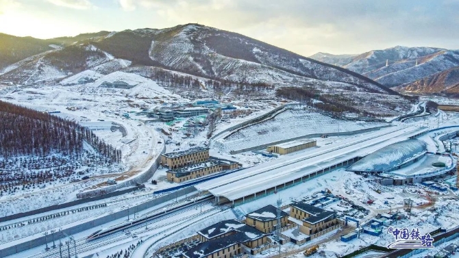 站房建筑以白色為主色調(diào),鳥瞰之下猶如鑲嵌在群山之間的明珠,彰顯了冬奧冰雪文化。