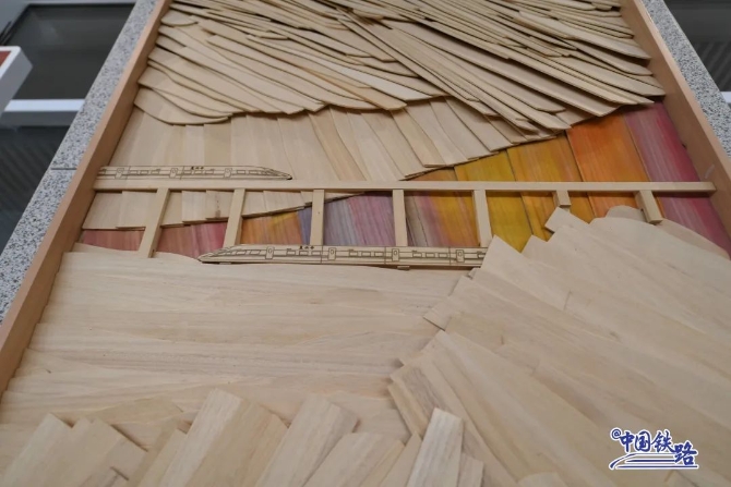 圓形立柱上分布有手工雕鑿而成的裝飾,通過陰影和色彩的不同,描繪出崇禮地區(qū)的山脈,也體現(xiàn)了太子城站的特色。