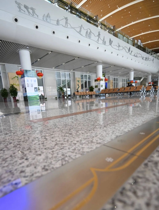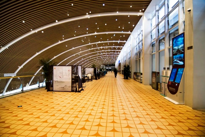 換乘中心采用了清水混凝土柱山水雕刻、馬賽克藝術(shù)墻、仿木龍骨吊頂?shù)人囆g(shù)處理,讓國內(nèi)外運動員和旅客在候車休息時可以欣賞中國傳統(tǒng)文化之美。