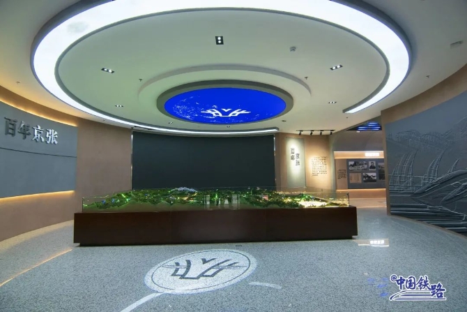 百年京張鐵路歷史展廳內(nèi),陳列著京張鐵路沙盤、京張鐵路及京張高鐵建設(shè)圖片、鋼軌模型、智能動車組列車模型等,講述著百年京張鐵路故事,展示了引領(lǐng)世界的京張高鐵新技術(shù)、新裝備,記錄中國鐵路的高速發(fā)展。