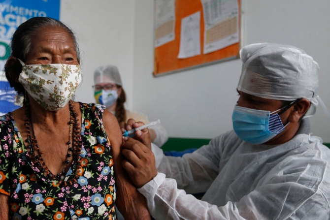 1月19日,在巴西亞馬孫州塔巴廷加市,醫(yī)護(hù)人員為一名原住民接種中國(guó)新冠疫苗。新華社發(fā)(盧西奧·塔沃拉攝)