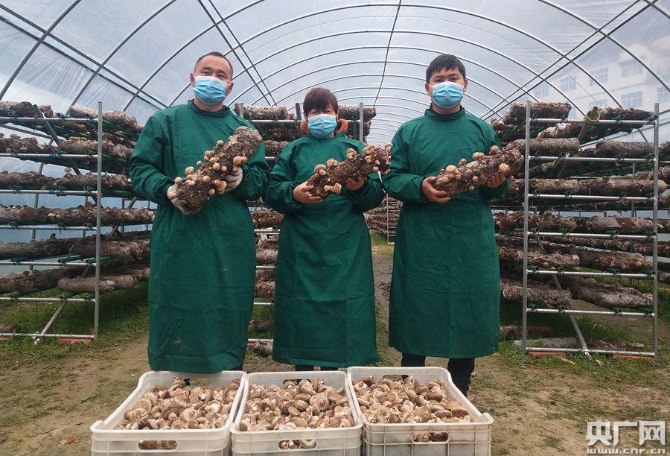 辛?xí)鴼J(左一)一家還在種植基地采摘香菇。(央廣網(wǎng)發(fā) 李宏飛 供圖)