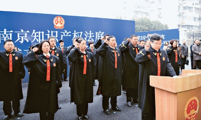 2017年至今,南京、武漢、深圳等22個地方法院知識產(chǎn)權(quán)法庭陸續(xù)設(shè)立,知識產(chǎn)權(quán)案件管轄布局不斷優(yōu)化,知識產(chǎn)權(quán)專門化審判體系建設(shè)不斷深入。圖為2017年1月19日南京知識產(chǎn)權(quán)法庭揭牌當(dāng)日,全體法官進行憲法宣誓。南京市中級人民法院供圖