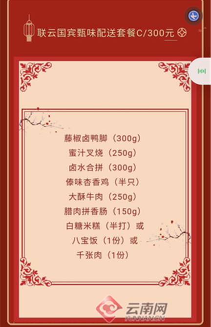 聯(lián)云集團運營管理部負責人表示,在秉承“安全、綠色、生態(tài)、健康”飲食理念的基礎上,集團將云菜創(chuàng)新菜品加入到國賓年夜飯菜單中,推出的國賓年夜飯除滿足堂食以外,更貼心的提供了“年夜飯配送服務”,讓消費者不出門就能品嘗到由國賓級大廚親手烹制的國賓年夜飯。