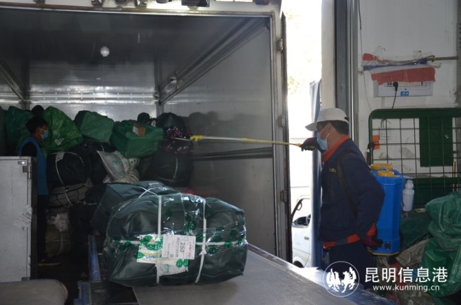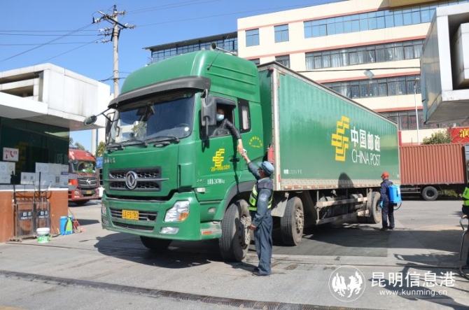 昆明郵區(qū)中心局工作人員正在對進局車輛進行消毒,對進局人員進行體溫檢測。