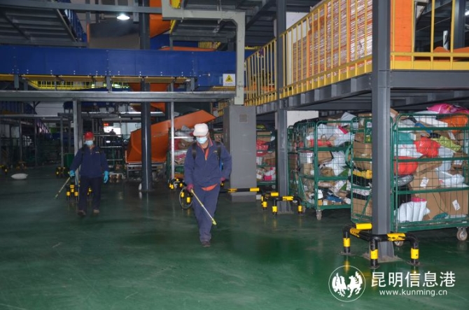 昆明郵區(qū)中心局抓實疫情常態(tài)化防控工作措施,工作人員對生產(chǎn)車間作業(yè)場地進行消毒。