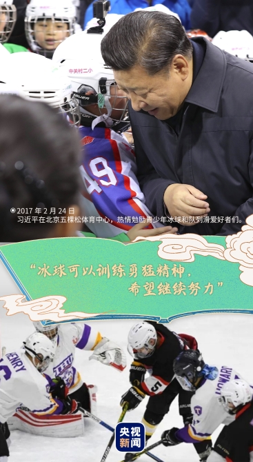 2017年2月24日,習(xí)近平總書記來到五棵松體育中心考察,同一群冰球少年親切交流。總書記還以冰球運動員特有的問候方式,同當(dāng)時9歲的官子釗“撞肩”互動。