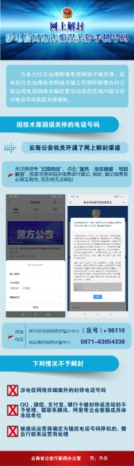 昆明信息港訊 記者合宇聰 日前,云南省公安廳發(fā)布《關(guān)于網(wǎng)上解封涉電信網(wǎng)絡(luò)詐騙誤關(guān)停手機(jī)號(hào)碼的公告》(以下《公告》),《公告》稱,云南警方對(duì)因技術(shù)原因誤關(guān)停的電話號(hào)碼,云南公安機(jī)關(guān)開通了網(wǎng)上解封渠道。