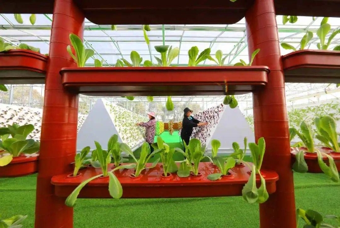 ▲ 2月3日,江西省撫州市東鄉(xiāng)區(qū)虎圩鄉(xiāng)下鄒村智慧蔬菜溫室大棚,員工正在查看蔬菜長勢。該區(qū)采用魚菜共生等現(xiàn)代化栽培技術(shù),打造智慧蔬菜園,助農(nóng)民增收。(饒方其/攝)
