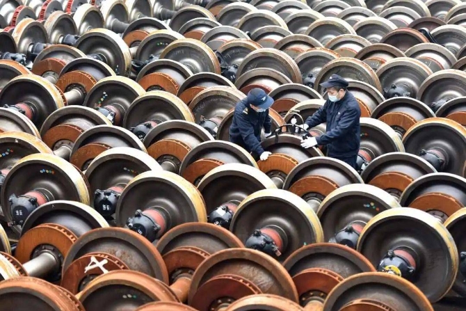 ▲ 2月2日,中國鐵路武漢局集團(tuán)有限公司武昌客車車輛段輪軸檢修庫內(nèi),工人對火車車輪進(jìn)行檢修,確保車輪“健康”。(彭琦/攝)