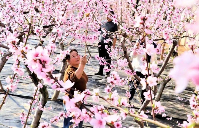 ▲ 2月1日,在甘肅省靜寧縣城川鎮(zhèn)暖棚里,桃花、杏花兒競相綻放,果農(nóng)忙著授粉。近年靜寧縣采取“基地+合作社+農(nóng)戶”的果蔬種植模式,吸納當(dāng)?shù)厝罕娫诩议T口就業(yè),取得了良好的經(jīng)濟(jì)效益和社會效益。(王毅/攝)
